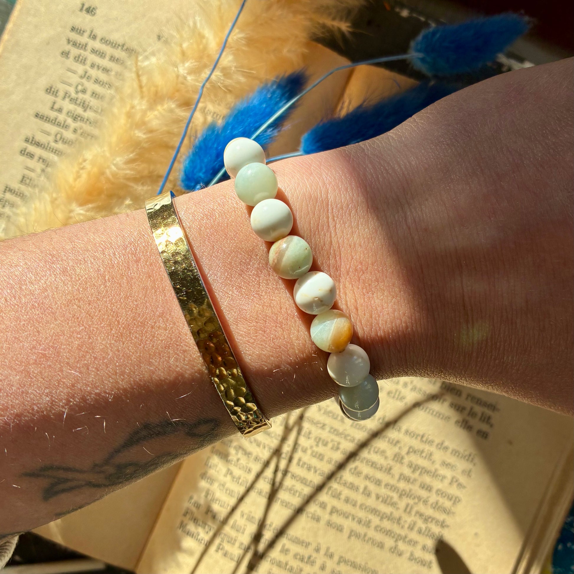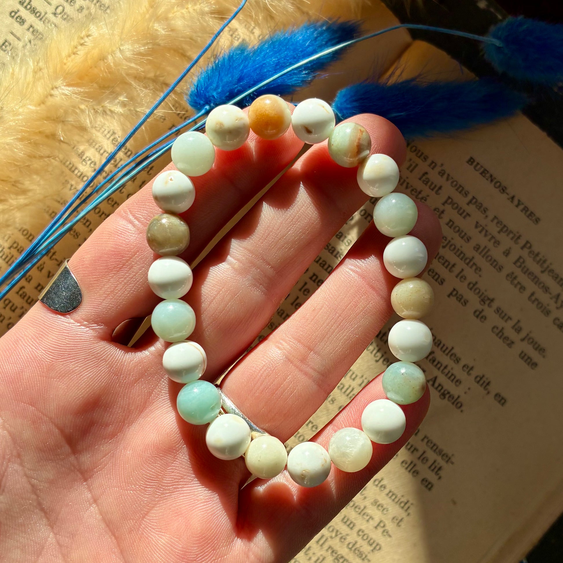 Un bracelet composé de magnésite et d’amazonite favorise l’apaisement émotionnel, l’équilibre intérieur et une communication plus sereine. La magnésite est reconnue pour ses vertus calmantes et relaxantes : elle aide à réduire le stress, à apaiser le mental et à encourager le lâcher-prise. Elle soutient la détente globale du corps et aide à mieux gérer les émotions liées aux tensions du quotidien.