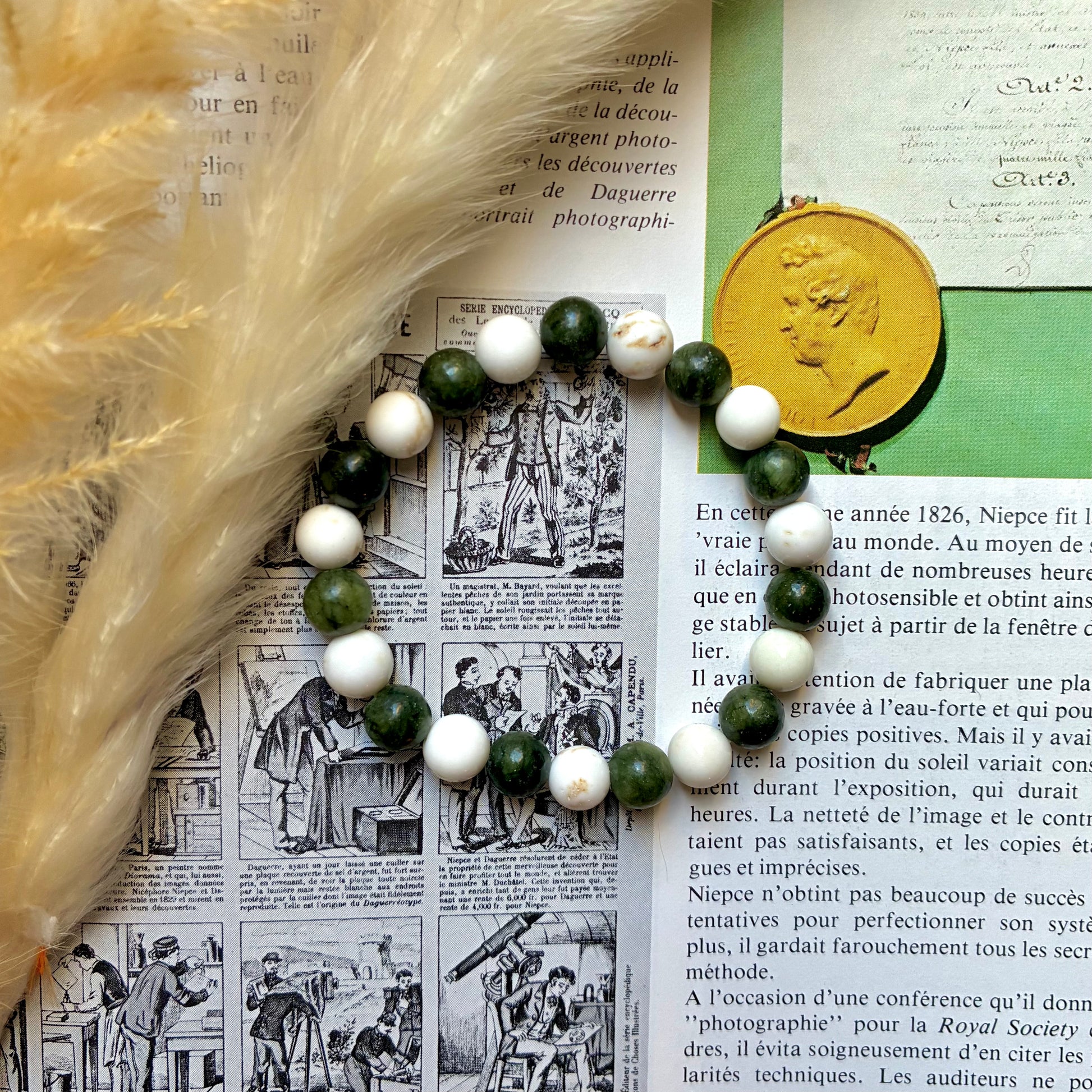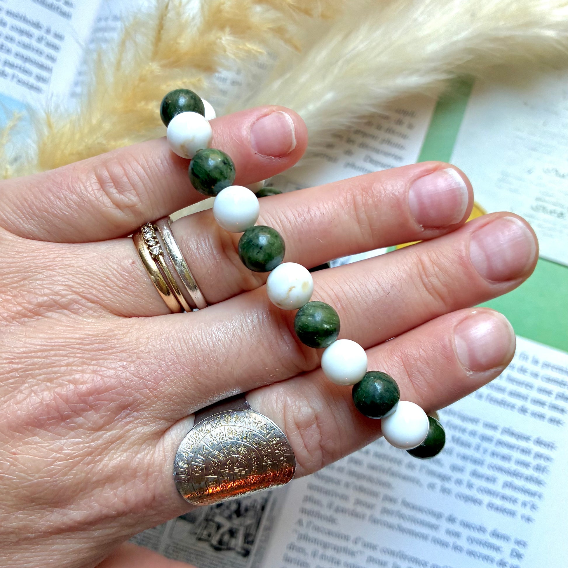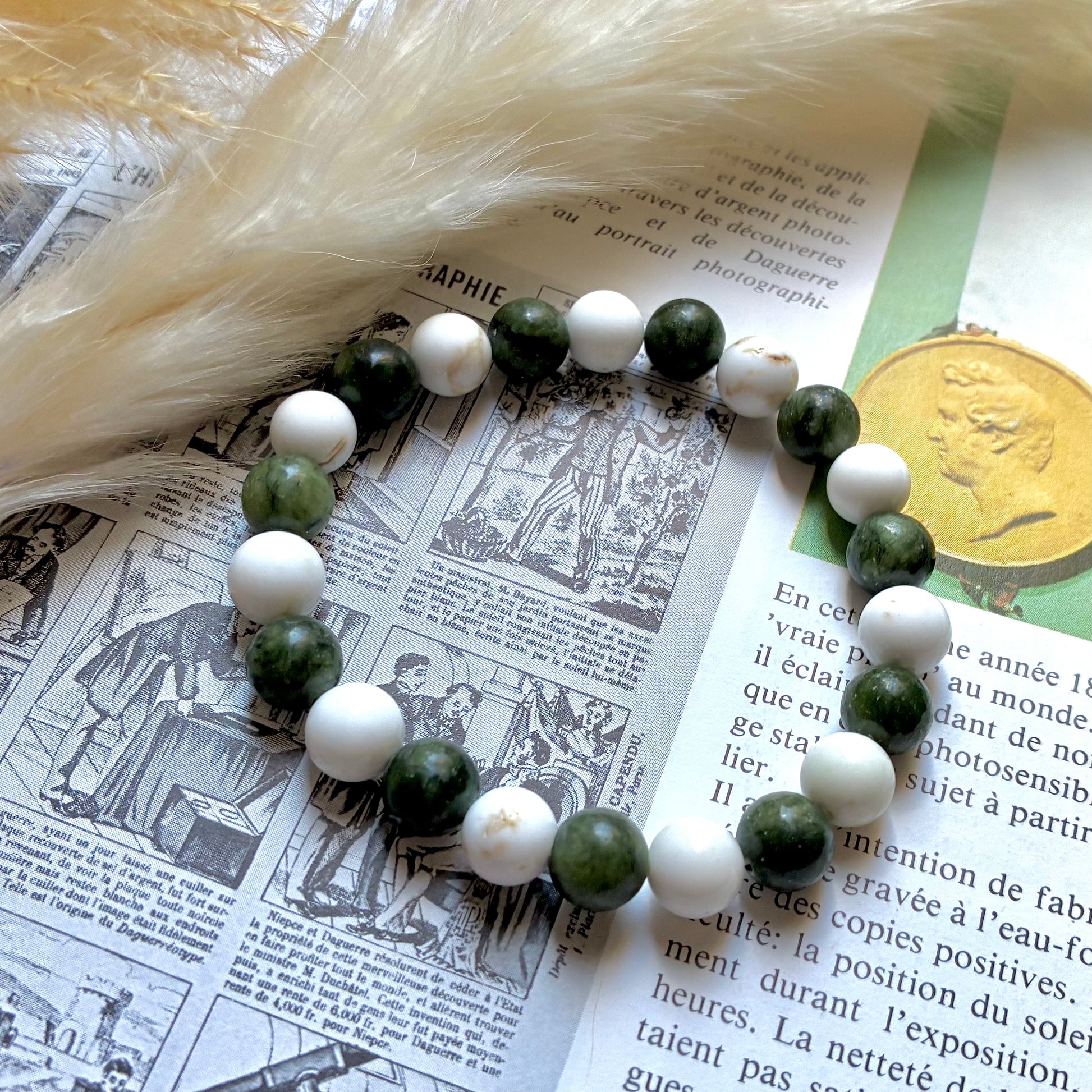 Un bracelet composé de magnésite et de jade vert favorise la détoxification, l’harmonie intérieure et l’ouverture à la chance. La magnésite est reconnue pour ses vertus profondément apaisantes et purifiantes. Elle aide à calmer le mental, à réduire le stress et à encourager le lâcher-prise, tout en soutenant l’élimination des tensions émotionnelles et énergétiques. Elle apporte douceur et clarté, essentielles pour retrouver un équilibre intérieur plus léger et fluide.